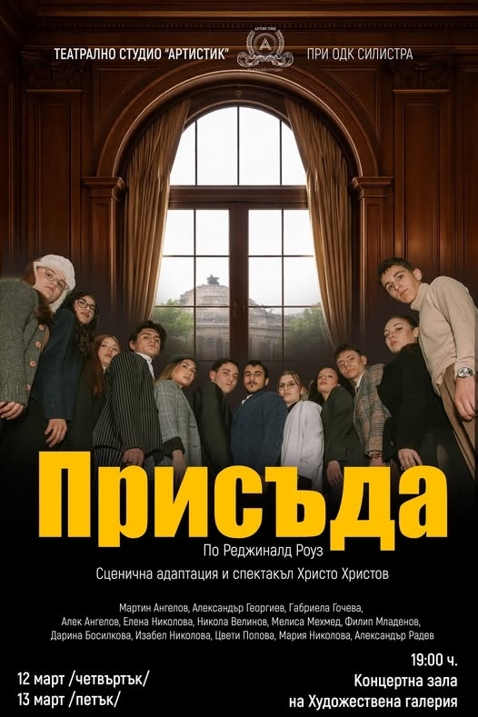 Театрално студио "Артистик" към ОДК – Силистра представя премиерата на спектакъла "Присъда", вдъхновен от "12 разгневени мъже" на Реджиналд Роуз и други текстове.