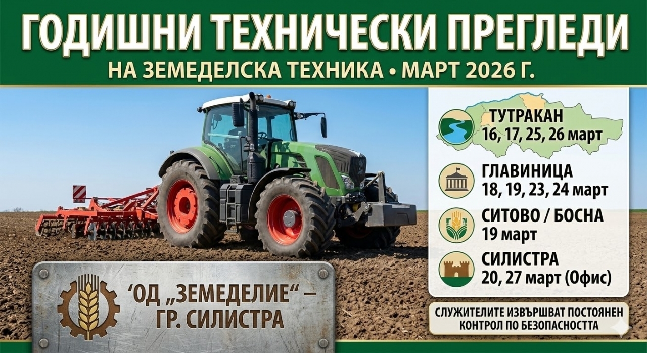 Областна дирекция "Земеделие" – град Силистра, обяви пълния график за провеждане на годишните технически прегледи на земеделска техника и прикачен инвентар през месец март 2026 година. Кампанията обхваща населени места в общините Тутракан, Главиница, Ситово и Силистра, като точните места за проверка по селата са предварително определени от съответните кметове.