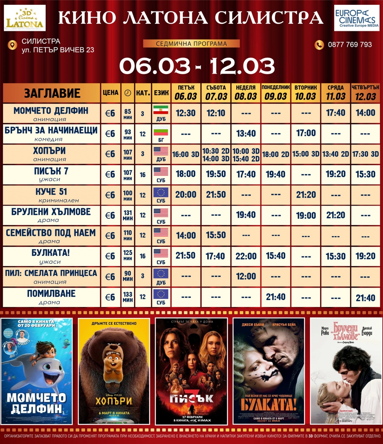 Кино Латона – Силистра кани всички жители и гости на града на една нова кино седмица, изпълнена с много емоции и жанрово разнообразие. Актуалната програма обхваща периода от 6 до 12 март, а прожекциите ще се състоят в познатия салон на улица "Петър Вичев" 23.