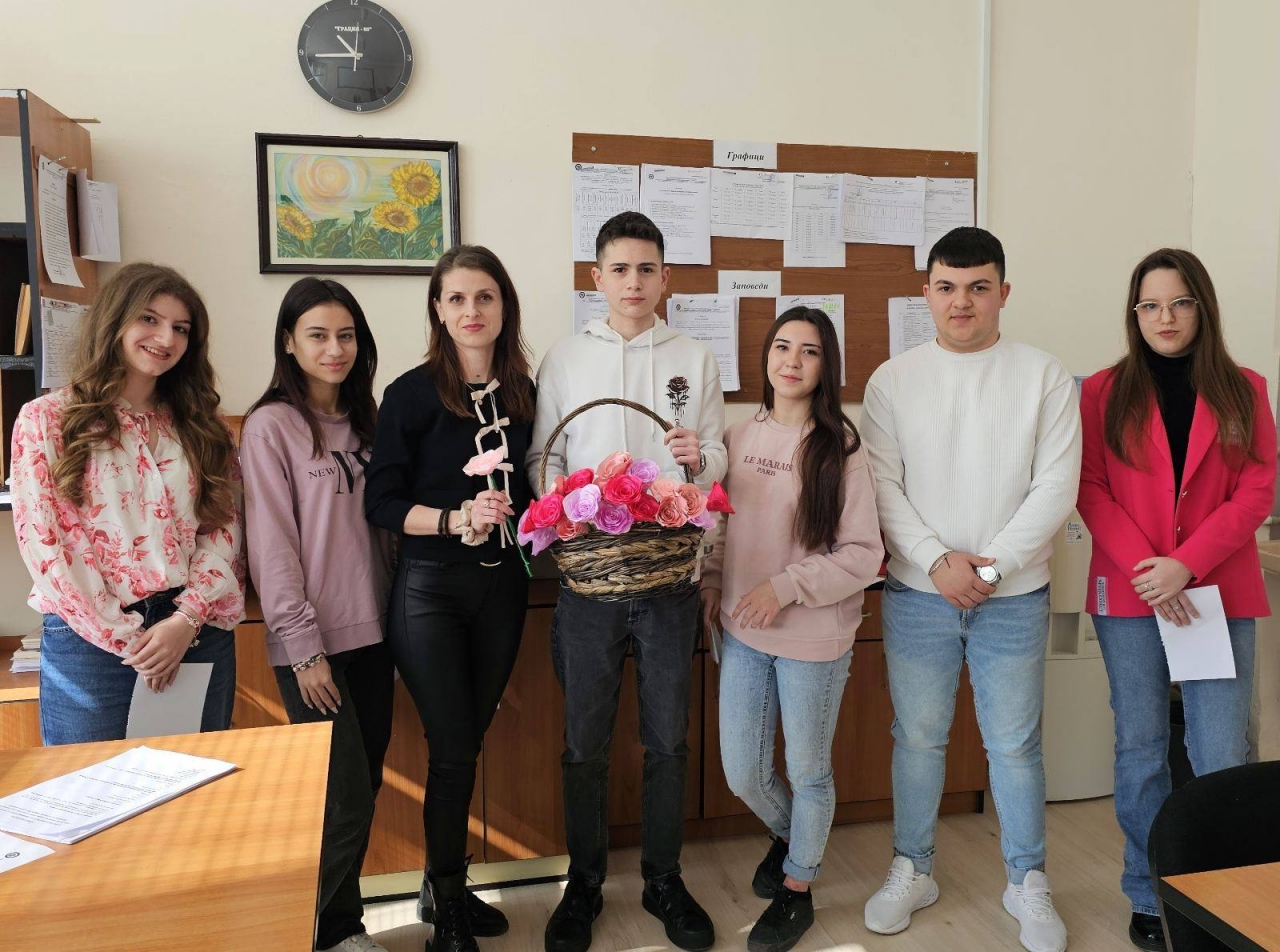 С много усмивки, мили думи и цветя младежите изразиха своята благодарност и уважение към учителките и служителките в гимназията. Учениците пожелаха на дамите здраве, щастие и вдъхновение както в професионалната им дейност, така и в ежедневието.