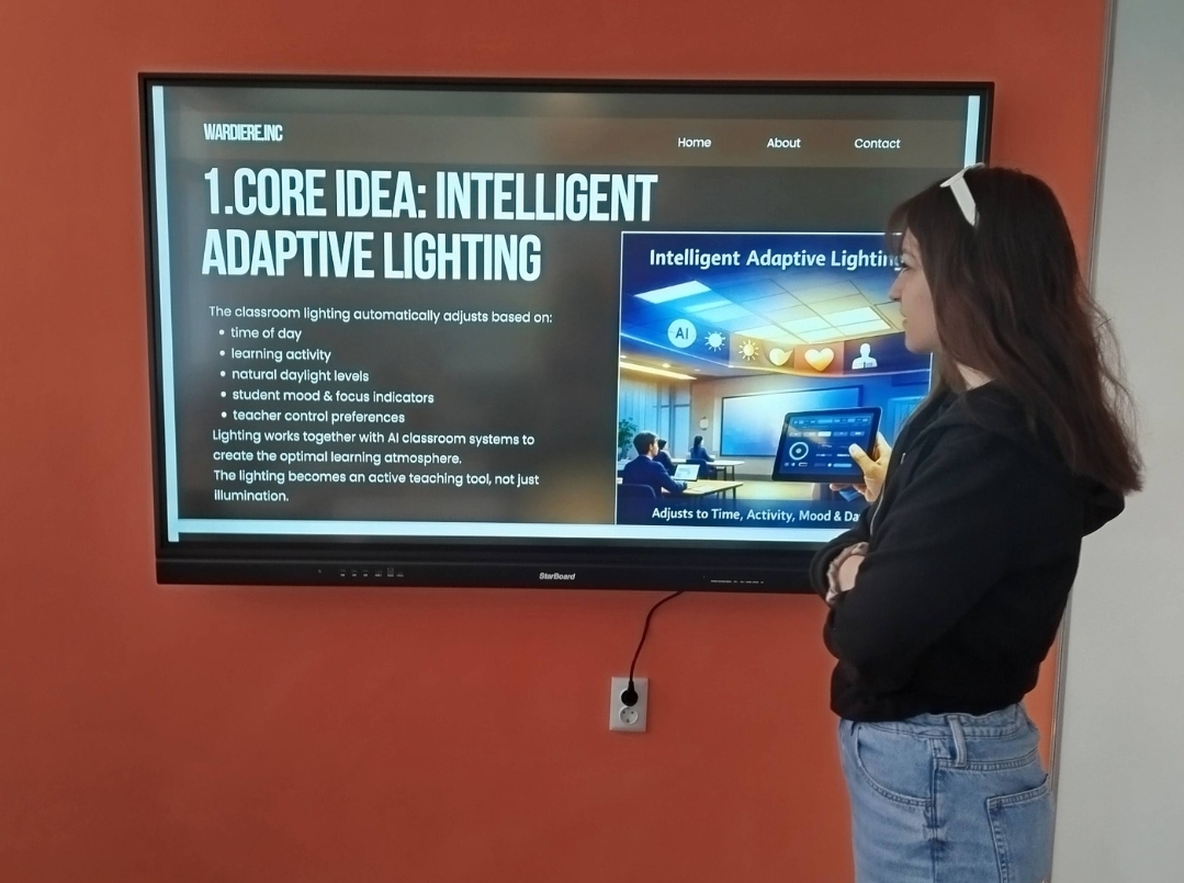 Чрез създаване на mood board и концептуални визуализации учениците представиха своето виждане за учебно пространство, което съчетава интелигентни технологии, гъвкаво разпределение на пространството и използване на екологични материали.