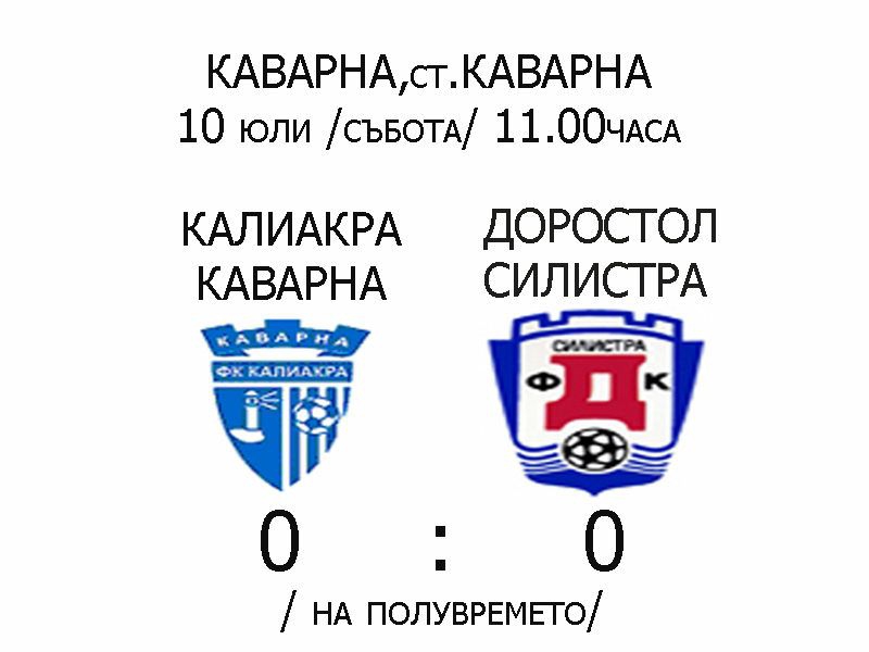 В момента се играе контролната среща между отборите на Калиакра (Каварна)и Доростол (Силистра) Мачът започна в 11.00 часа. Двубоят се провежда на градския стадион в Каварна. Резултатът на полувремето е 0:0. Очаквайте подробности...