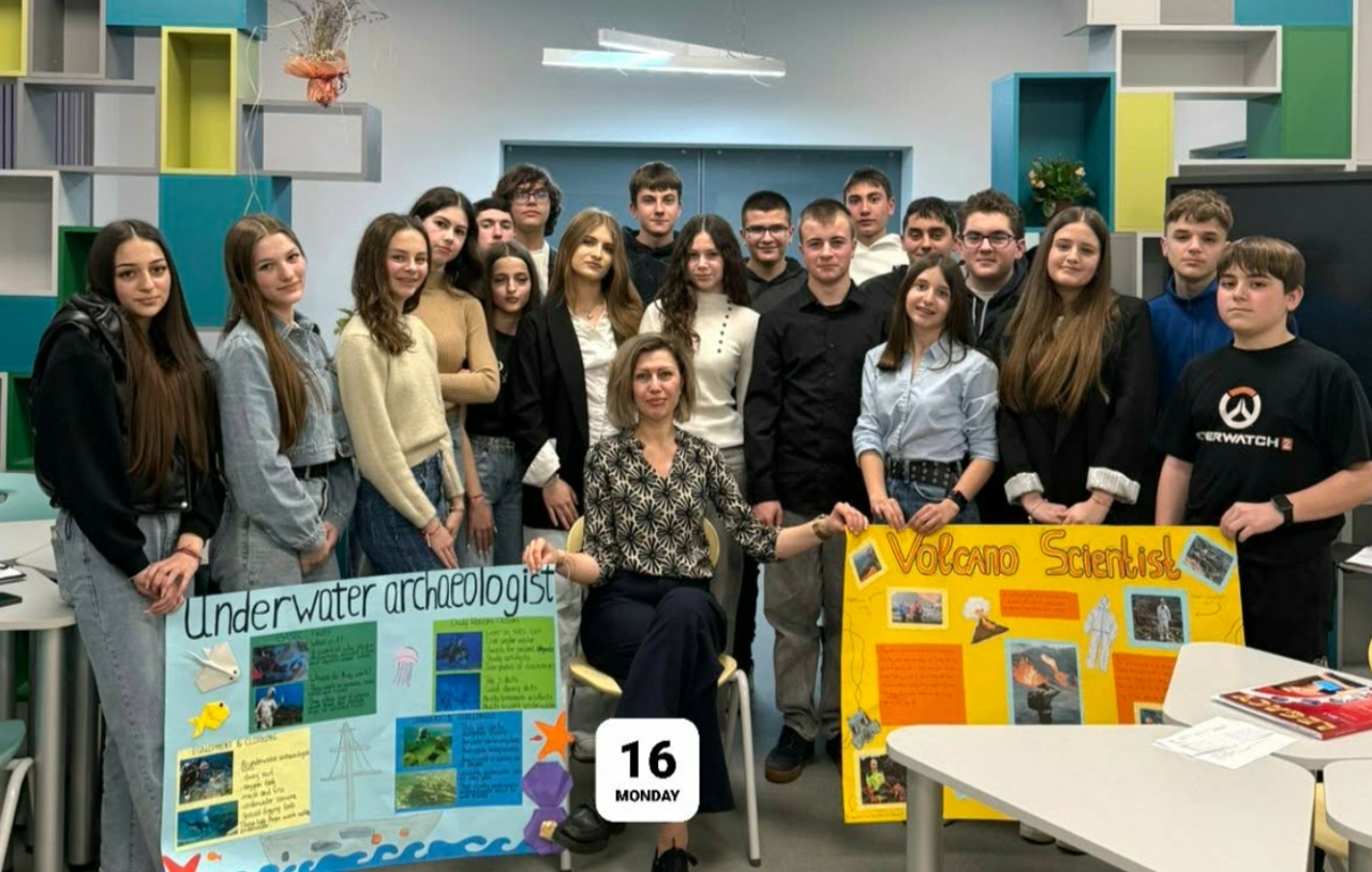 Втората част на урока беше посветена на групови проекти, представени под формата на постери. Пет екипа представиха на английски език различни професии, изискващи смелост, знания и дисциплина, сред които подводен археолог, вулканолог, морски биолог, пещерен водолаз и фотограф на дива природа.