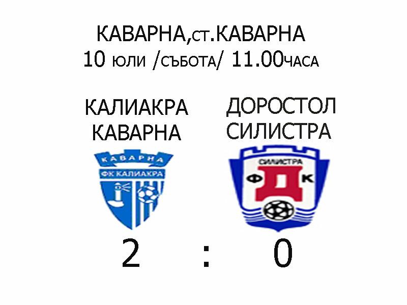 Прикючи контролната среща между отборите на Калиакра (Каварна)и Доростол (Силистра). Мачът започна в 11.00 часа. Двубоят се проведе на градския стадион в Каварна. Резултатът на полувремето бе 0:0. Силистренци стояха по-добре на терена през първото полувреме, като изпуснаха две чисти положения. След почивката, бяха направени множество смени, които се отразиха на играта на отбора. Въпреки това, равния резултат се запази до 88 мин на мача, когато за задържане в наказателното поле, срещу Доростол бе отсъдена и реализирана дузпа. В последната 90 мин на мача, получихме втори гол от пряк свободен удар.