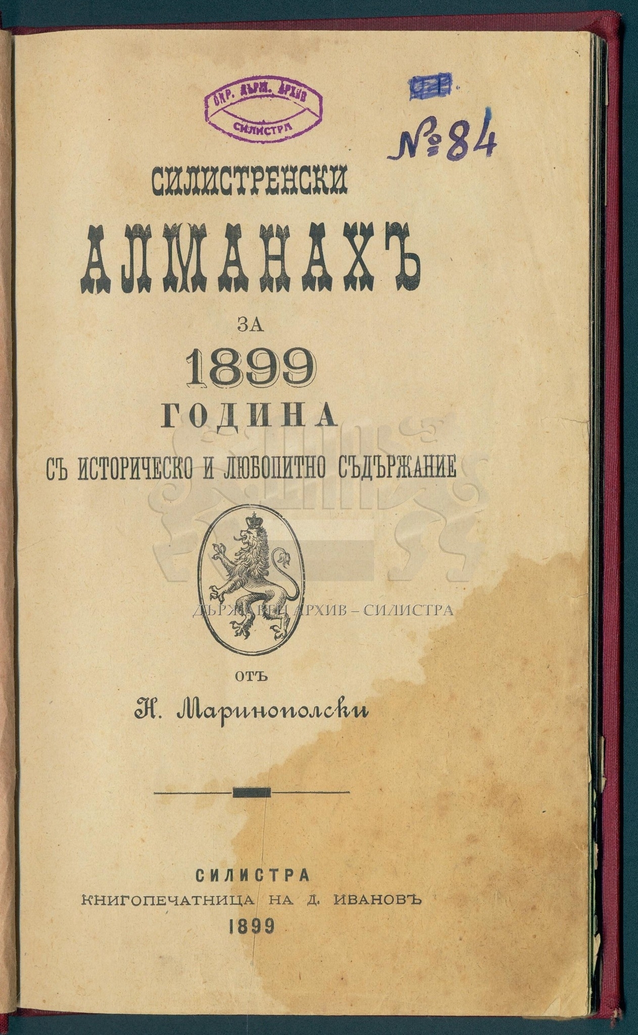 По повод 75 години от създаването на архивите в България, Държавен архив – Силистра представя в рубриката "Ценни книги" едно от най-значимите местни издания – "Силистренски алманах за 1899 с историческо и любопитно съдържание" от Никола Маринополски.