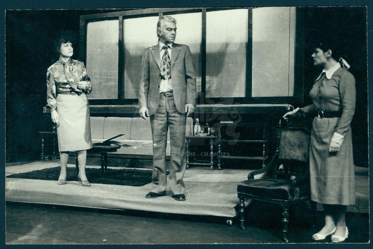 Снимка от театралната постановка "Бряг", сезон 1979/1980, с участието на Л. Киселички, П. Карпова и Кр. Игнатова