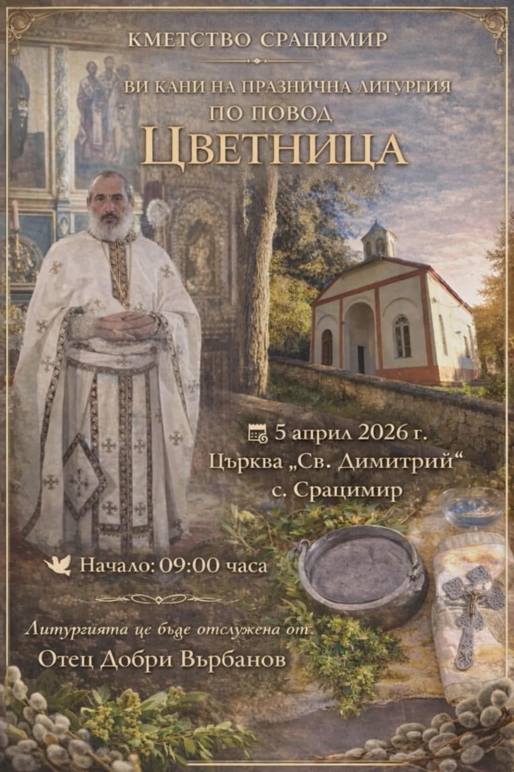 Светата служба ще бъде отслужена на 5 април 2026 г. от 9:00 часа в църквата "Св. Димитрий" в село Срацимир. Литургията ще бъде водена от отец Добри Върбанов.