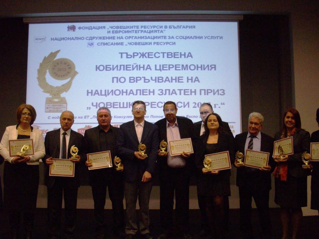 Национален златен приз "Човешки ресурси" се присъжда на организации, които в сферата на своята професионална дейност имат най-голям принос за непрекъснатото професионално усъвършенстване и ефективното управление на човешкия потенциал, за внедрените иновации в тази област и за подобряване на качеството и производителността на труда в звената и институциите, които ръководят. Сред наградените в различните категории са кметове на общини като Търговище и Нови Пазар; Гинка Чавдарова, председател на НСОРБ; директор на СОУ във Видин, на социални домове в Подгумер и София; фирми като "Нестле България", "Фиал" и "Граммер"; фондация "Пиа Матер"; посланикът на Финландия Харри Салми, ректоратът на Техническия университет в София и др.