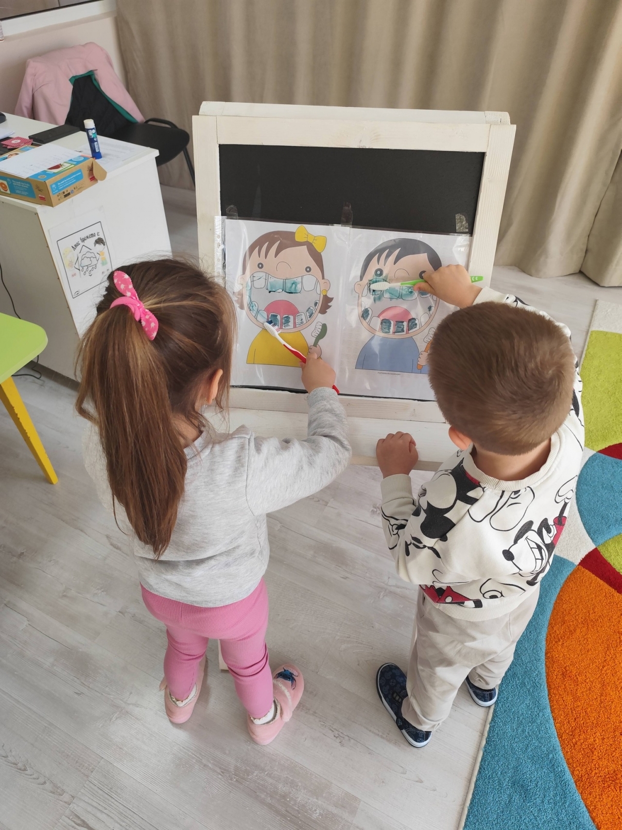 Децата се включиха с голям ентусиазъм в разнообразни игри, чрез които затвърдиха знанията си за здравословното хранене и личната хигиена. Сред заниманията бяха "Кое къде расте", "Намери еднаквите", "Познай по аромата", подреждане на "Здравословна чиния" и демонстрации на правилно миене на зъбите.