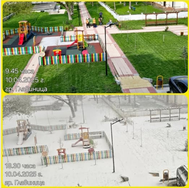 Емблематичен за този ден остава примерът от град Главиница. Кметът на общината, г-н Неждет Джевдет, сподели два кадъра от охранителна камера, които илюстрират невероятния контраст в рамките на само няколко часа. В 9:45 ч. сутринта паркът в града е потънал в пролетна зеленина със свежо окосена трева и слънчева светлина. До 18:30 ч. вечерта същата площадка вече е под дебела снежна покривка, превръщайки пролетния пейзаж в истинска зимна сцена.