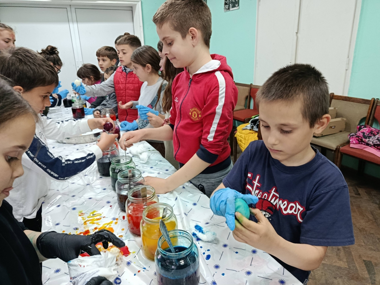 Децата работиха самостоятелно, демонстрирайки креативност и сръчност – потапяха яйцата в различни багри, рисуваха с четки и добавяха разнообразни украси. Част от тях заложиха на традиционни мотиви, докато други експериментираха със смели цветови комбинации, създавайки истински малки произведения на изкуството.