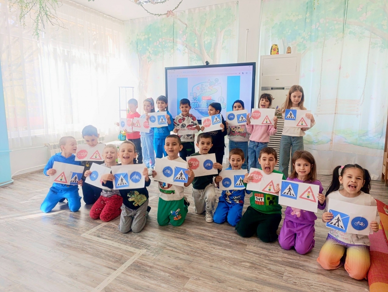 Под формата на игри и занимания децата се запознаха с основни пътни знаци и тяхното значение. Малчуганите научиха, че триъгълникът не е само форма, а важен предупредителен знак, а светофарът изисква внимание и спазване на сигналите.