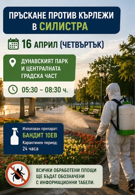 Община Силистра уведомява гражданите, че на 16 април (четвъртък) ще се проведе обработка против кърлежи в Дунавския парк и централната градска част.