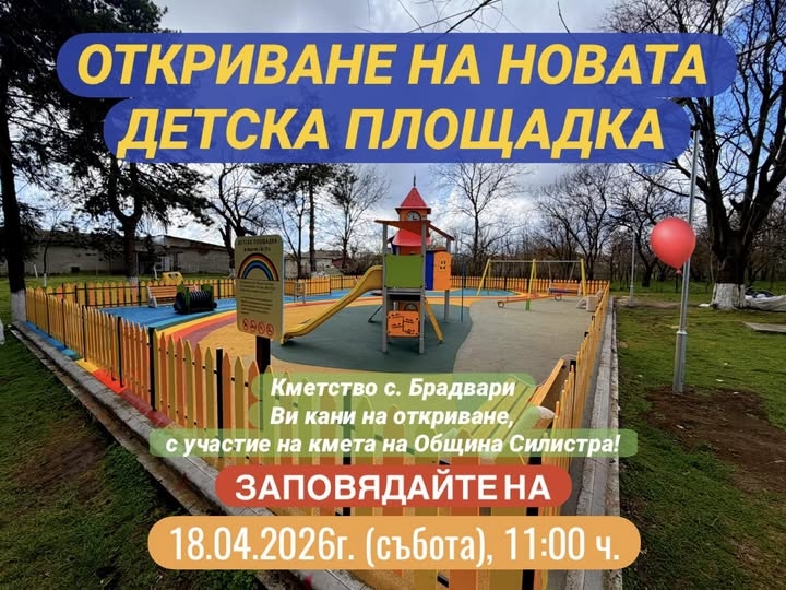 Жителите на село Брадвари ще имат повод за празник тази събота – 18 април 2026 г., когато официално ще бъде открита новата детска площадка в населеното място. Инициативата е на Кметството в селото и цели да създаде модерно и безопасно пространство за игра и отдих на най-малките.