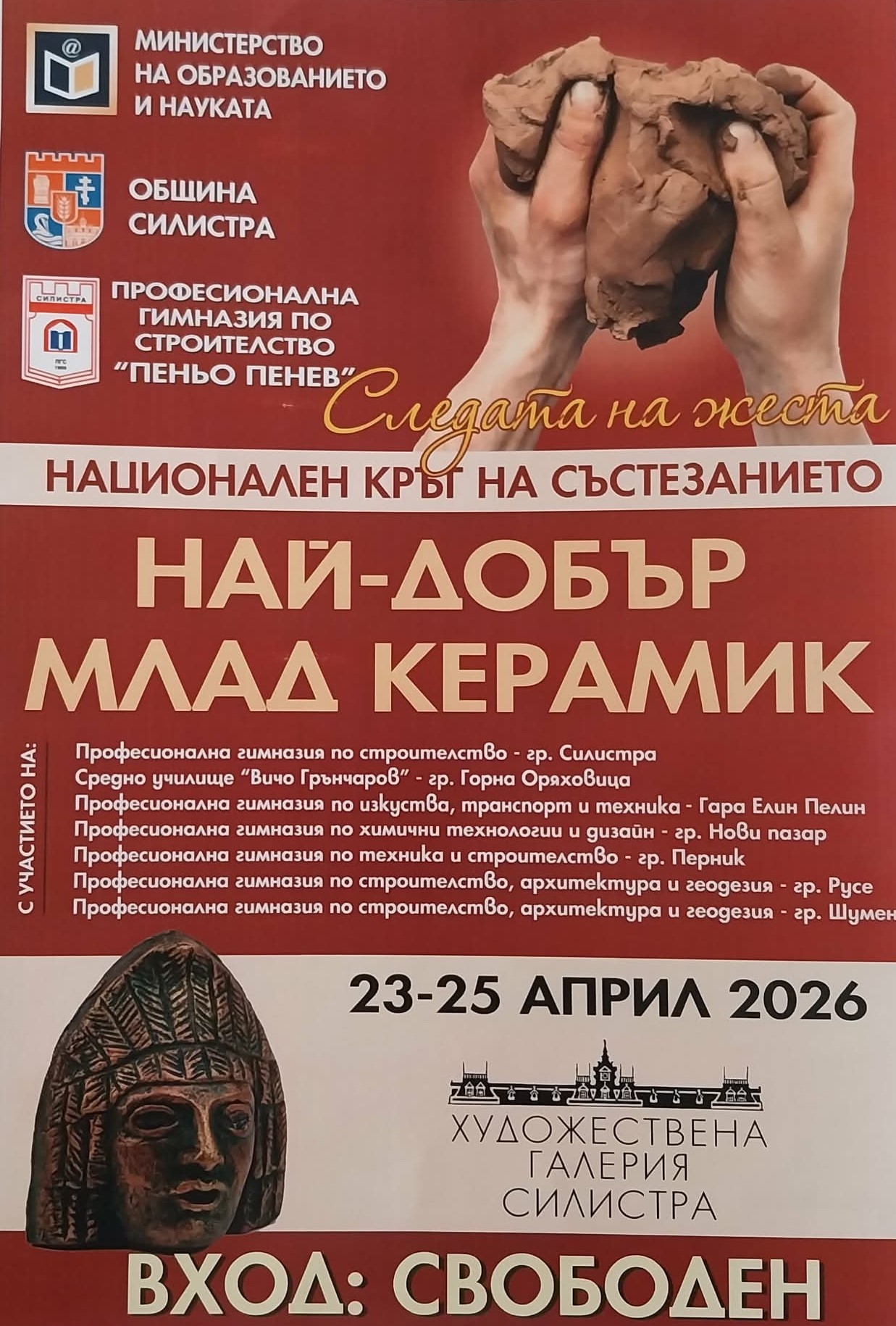 За втора поредна година в град Силистра ще се проведе националния етап на състезанието "Най-добър млад керамик". Събитието, под надслов "Следата на жеста", се реализира с подкрепата на Министерството на образованието и науката и Община Силистра и се организира от Професионална гимназия по строителство "Пеньо Пенев" – училище, което се утвърди като ключов фактор за културния и образователен подем на региона.