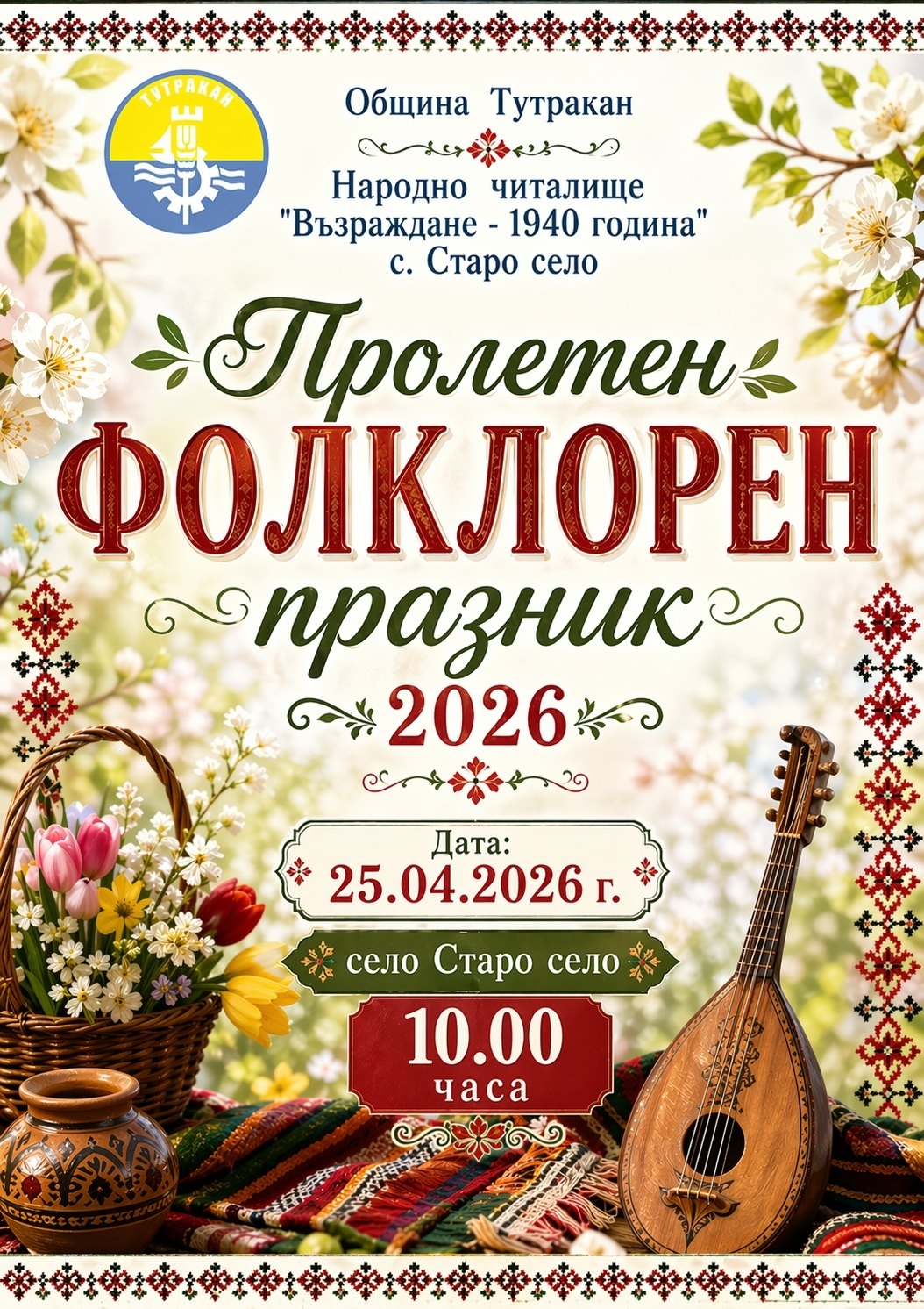 Община Тутракан и НЧ "Възраждане – 1940 година" – с. Старо село отправят покана към жителите и гостите на региона за участие в Пролетен фолклорен празник 2026.