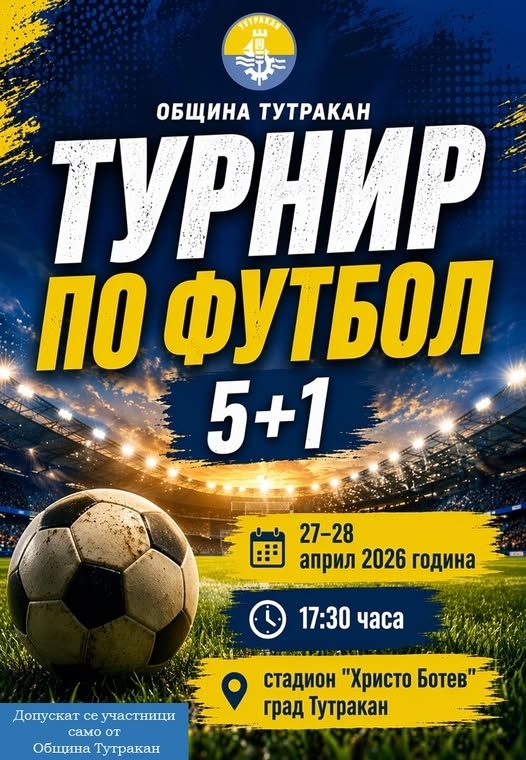 Община Тутракан обяви провеждането на футболен турнир във формат 5+1, който ще се състои на 27 и 28 април 2026 г. в Тутракан.