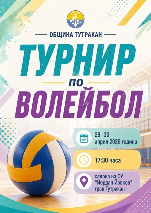 Община Тутракан организира турнир по волейбол, който ще се проведе на 29 и 30 април 2026 г. в спортния салон на СУ "Йордан Йовков" – Тутракан. Началото на срещите и в двата дни е от 17:30 часа.