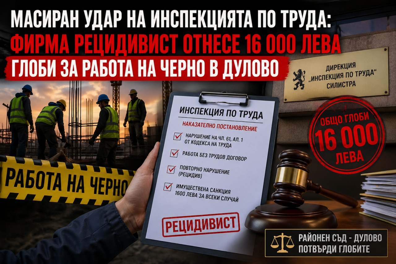 Районният съд в Дулово, под председателството на съдия Емил Николаев, потвърди безпрецедентна серия от десет наказателни постановления срещу едно и също търговско дружество за груби нарушения на трудовото законодателство. Решенията, постановени в един и същи ден – 6 април 2026 година, са категоричен отговор срещу порочната практика за наемане на работници без трудови договори. Глобите, наложени от Дирекция "Инспекция по труда" - Силистра, възлизат на общо 16 000 лева.