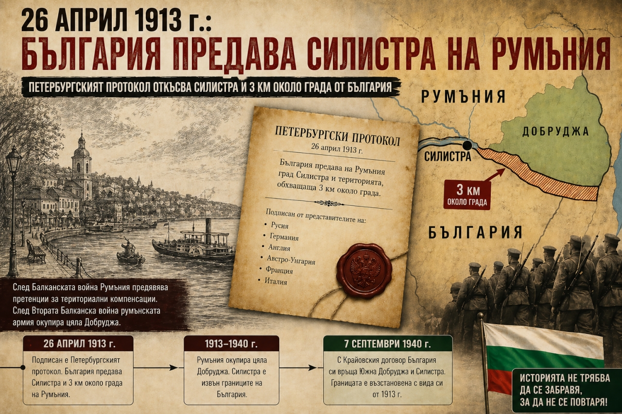 Българската история е изпълнена с моменти на възход и изпитания, които често остават в сянка на по-известните събития. Един от тях е датата 26 април 1913 г., когато с подписването на Петербургския протокол България е принудена да отстъпи Силистра и прилежаща територия на Румъния.