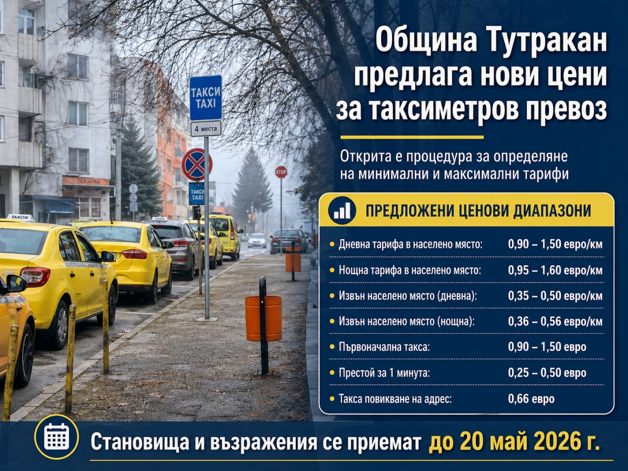 Община Тутракан обяви откриване на производство по издаване на общ административен акт, с който ще бъдат определени минималните и максималните цени за таксиметров превоз на пътници на територията на общината.