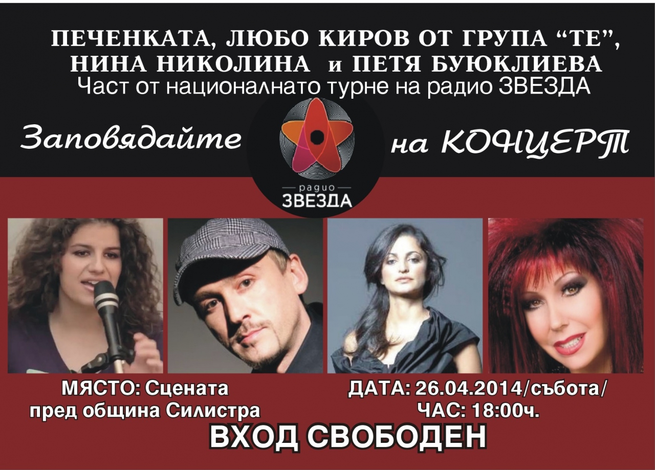 С внушителен концерт на централния площад в Силистра ще завърши световният екоден на 26 април, в който България се включва за пореден път. Музикалното събитие е дело на новото национално радио ЗВЕЗДА, което отскоро е в безкрайния ефир на световната информационна мрежа "Интернет". На сцената от 18 часа своите безспорни качества на бийт-изпълнител ще покаже Адриана Николова – Печенката. Журиралият преди време в телевизионния формат "Гласът на България" солист на група "ТЕ" Любо Киров, заедно с Нина Николина и Петя Буюклиева ще дадат принос в настроението в чест на силистренци.