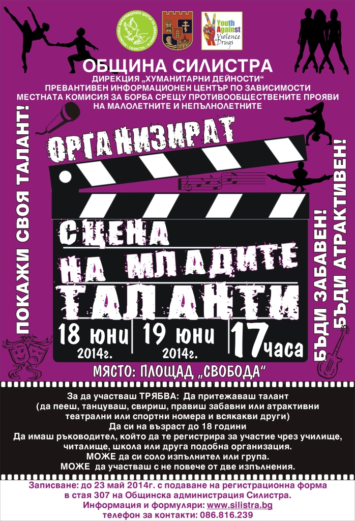 Община Силистра, Дирекция "Хуманитарни дейности", Превантивен информационен център по зависимости и Местната комисия за борба срещу противообществените прояви на малолетните и непълнолетните ще проведат на 18 и 19 юни 2014 г. от 17 часа на площад "Свобода" "Сцена на младите таланти". Събитието ще се проведе за пръв път.