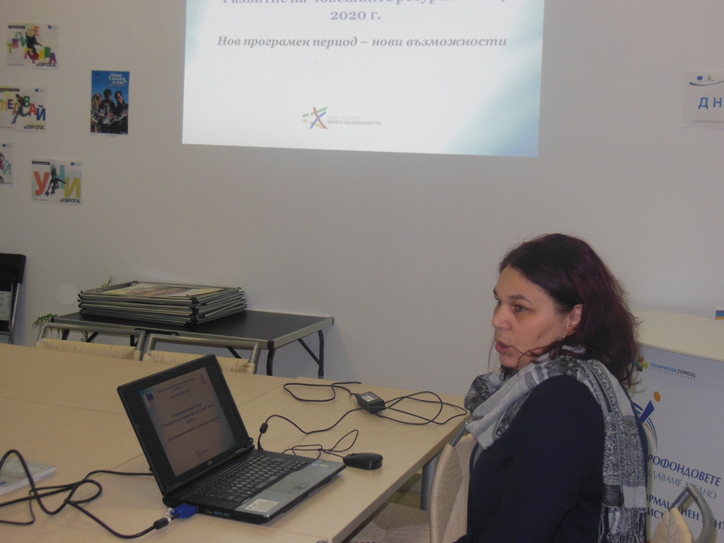 В Областния информационен център се проведе представяне на Оперативна програма "Развитие на човешките ресурси 2014-2020 г." под мотото "Нов програмен период – нови възможности". Акцентите в него са осигуряване на повече и по-качествени работни места, както и подкрепа за активното социално включване за всички лица в неравностойно положение.