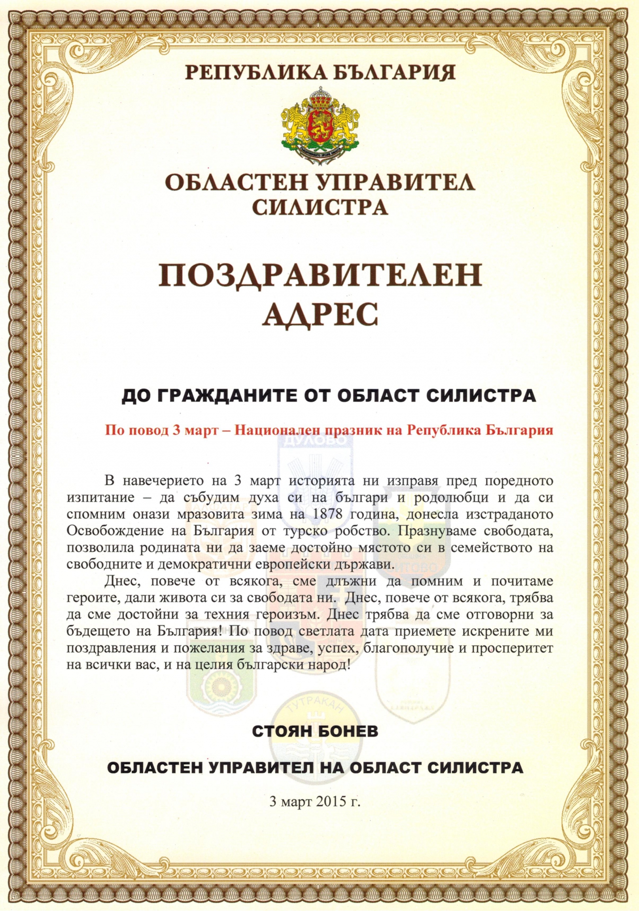 Областният управител на област Силистра г-н Стоян Бонев отправи поздрав до жителите на областта по повод 3 март - Национален празник на Република България. В него се казва: "В навечерието на 3 март историята ни изправя пред поредното изпитание - да събудим духа си на българи и родолюбци и да си спомним онази мразовита зима на 1878 година, донесла изстраданото Освобождение на България от турско робство. Празнуваме свободата, позволила родината ни да заеме достойно мястото си в семейството на свободните и демократични европейски държави. Днес, повече от всякога, сме длъжни да помним и почитаме героите, дали живота си за свободата ни. Днес, повече от всякога, трябва да сме достойни за техния героизъм. Днес трябва да сме отговорни за бъдещето на България! По повод светлата дата приемете искрените ми поздравления и пожелания за здраве, успех, благополучие и просперитет на всички вас, и на целия български народ!"