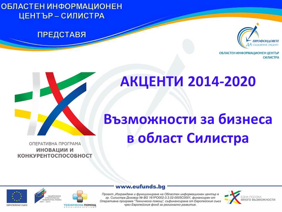 Областен информационен център – Силистра ще проведе информационна среща на тема "Акценти 2014-2020 – възможности за бизнеса в област Силистра". Експертите ще представят одобрената оперативна програма "Иновации и конкурентоспособност", както и предстоящи процедури за кандидатстване с проекти през 2015 г.