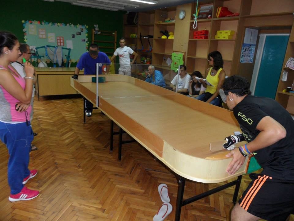 Справка: Шоудаунът (на английски: Showdown) е спорт за незрящи, който може да се оприличи на тенис на маса. За разлика от тениса на маса, ударите при шоудауна се правят с бата. Топчето е по-голямо, то се търкаля по масата и издава специфичен шум, по който незрящите се ориентират къде се намира то. Размерите