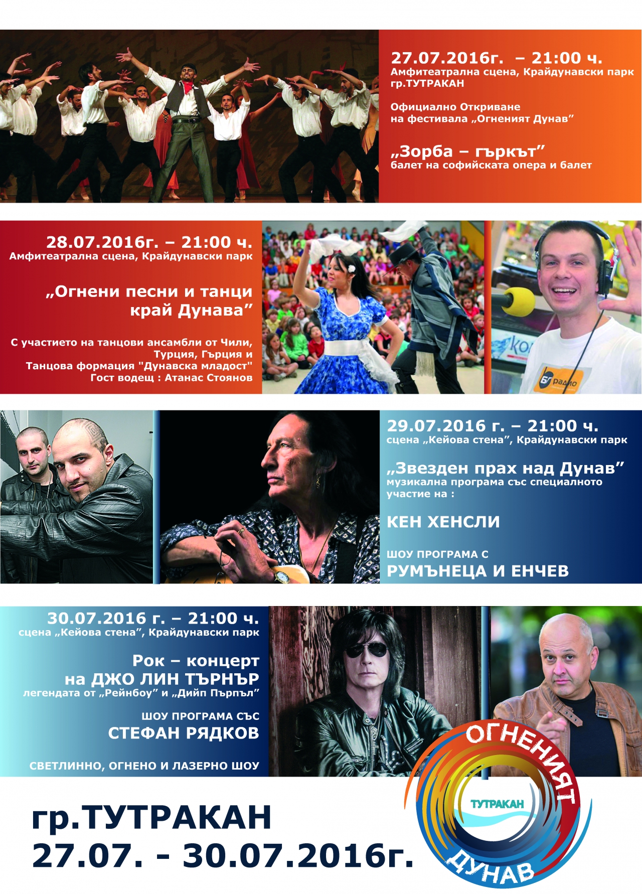 "Ще започнем на 27 юли с балета "Зорба Гъркът" на Националната опера и балет, който е игран само в пет областни центрове в страната и по една щастлива случайност в едно малко градче като Тутракан" – повдига завесата д-р Стефанов. Втората вечер е посветена на фолклора. Ще гостуват фолклорни ансамбли от Чили, Гърция и дервишите от побратимения град Чорлу, Турция. Третата вечер е за младежите и е посветена на поп и рап музиката. Ще стартират с изпълненията на Румънеца и Енчев, след което ще се премине към мелъди рок с една млада софийска група, която ще подгрее и големия концерт на Кен Хенсли.