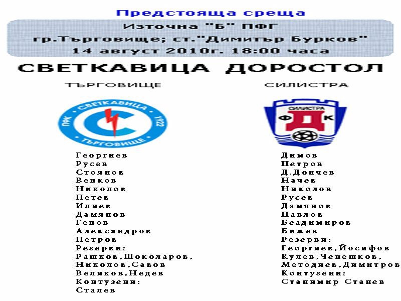 След броени минути от 18:30 часа родния "Доростол" ще влезе на стадион "Димитър Бурков" в мач на Източна "Б" ПФГ срещу състава на "Светкавица" Търговище.Ясни са съставите на двата отбора. Единствената новина е контузията на Станимир Станев, който пропуска двубоя. Мачът започва половин час по-късно, поради големите жеги. Да пожелаем успех и късмет на "Доростол"!