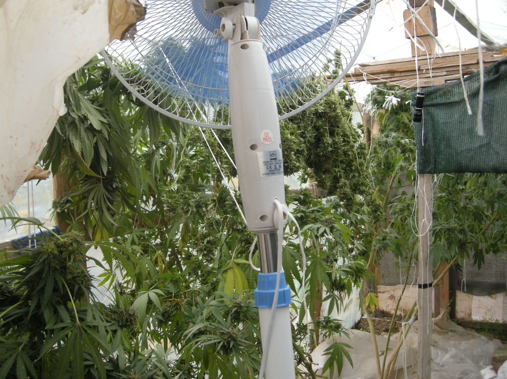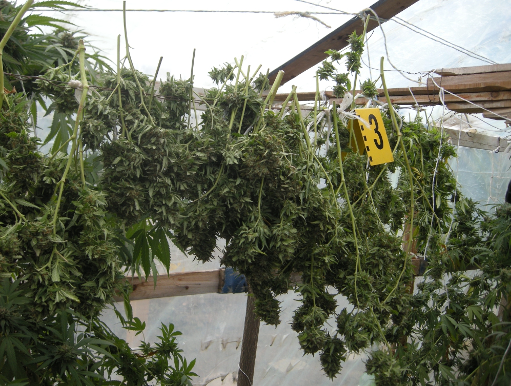 Последвало претърсване на къщата на Д.Б., където криминалистите намерили около 500 г суха листна маса канабис, част от която разпределена в единични дози. Намерени били и облицовани във фолио съдове с канабис в процес на сушене.