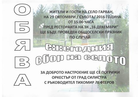 Гарван ще празнува на 29 октомври 25 Октомври 2016 г. Култура 1484 На 29 октомври (събота) жителите и гостите на село Гарван ще празнуват общоселски празник по случай ежегодния сбор на селото.