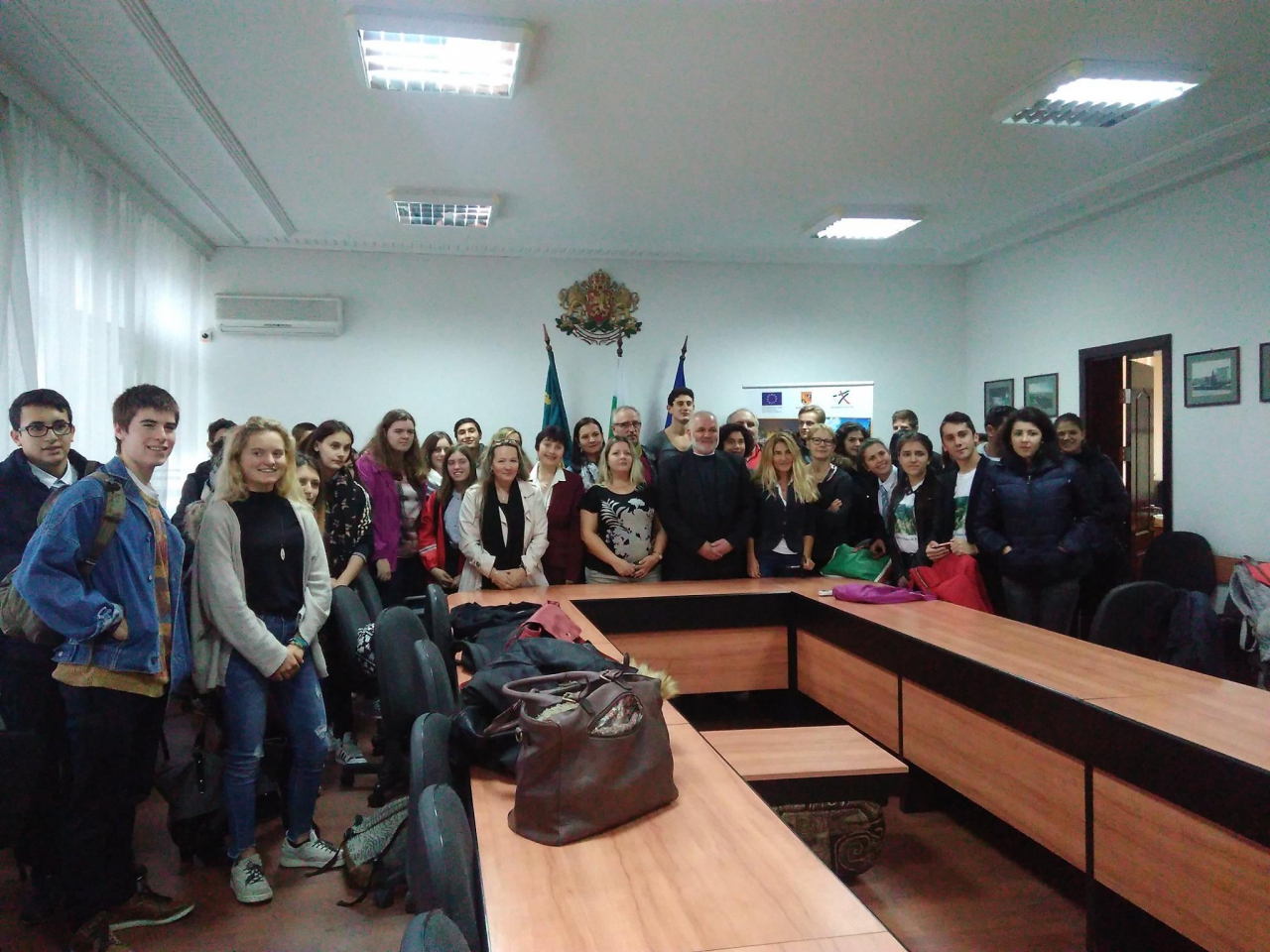 27 учители и ученици от Италия, Белгия, Румъния и Франция, заедно с техните партньори от ПГСУАУ "А. Буров" гр. Силистра, гостуваха на кмета на община Силистра д-р Юлиян Найденов. Срещата е част от тяхната визита по повод реализирането на Проект по програма Еразъм плюс "Устойчива Европа". Координатор на Проекта е гимназия "Ат. Буров" с работен език - френски, а тематиката е екологична. Като домакин на срещата, д-р Найденов посрещна представителите на петте европейски държави и ги приветства с "добре дошли". Той представи накратко пред тях историята, културните и природни забележителности на града в 7 минутен късометражен филм за Силистра. Учениците от Италия, Белгия, Румъния и Франция имаха възможността да зададат своите въпроси към кмета.