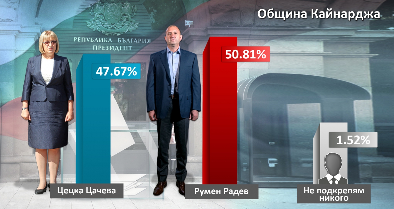 Кандидатпрезиденската двойка Румен Радев-Илияна Йотова спечели изборите в община Кайнарджа на втория тур с 50,81 на сто.