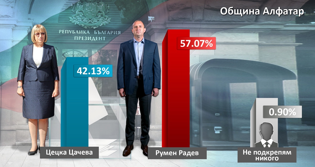 Кандидатпрезиденската двойка Румен Радев-Илияна Йотова спечели изборите в община Алфатар на втория тур с 57,07 на сто.