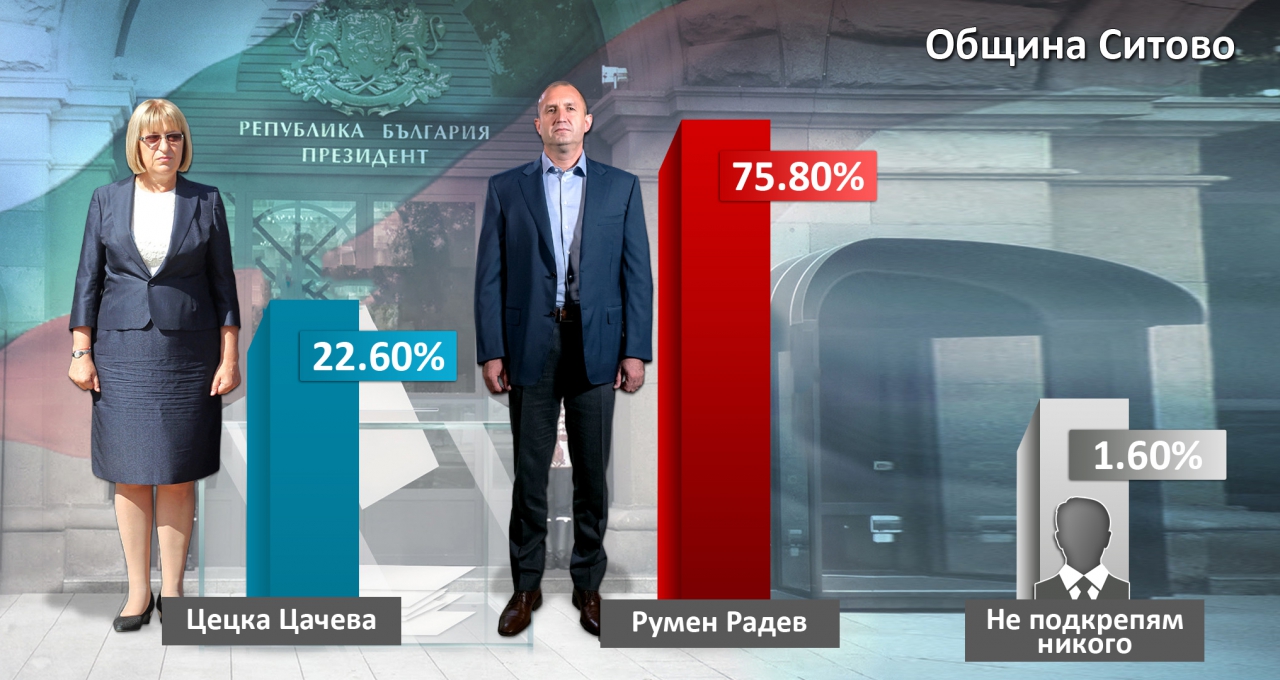 Кандидатпрезиденската двойка Румен Радев-Илияна Йотова спечели изборите в община Ситово на втория тур с 75,80 на сто.