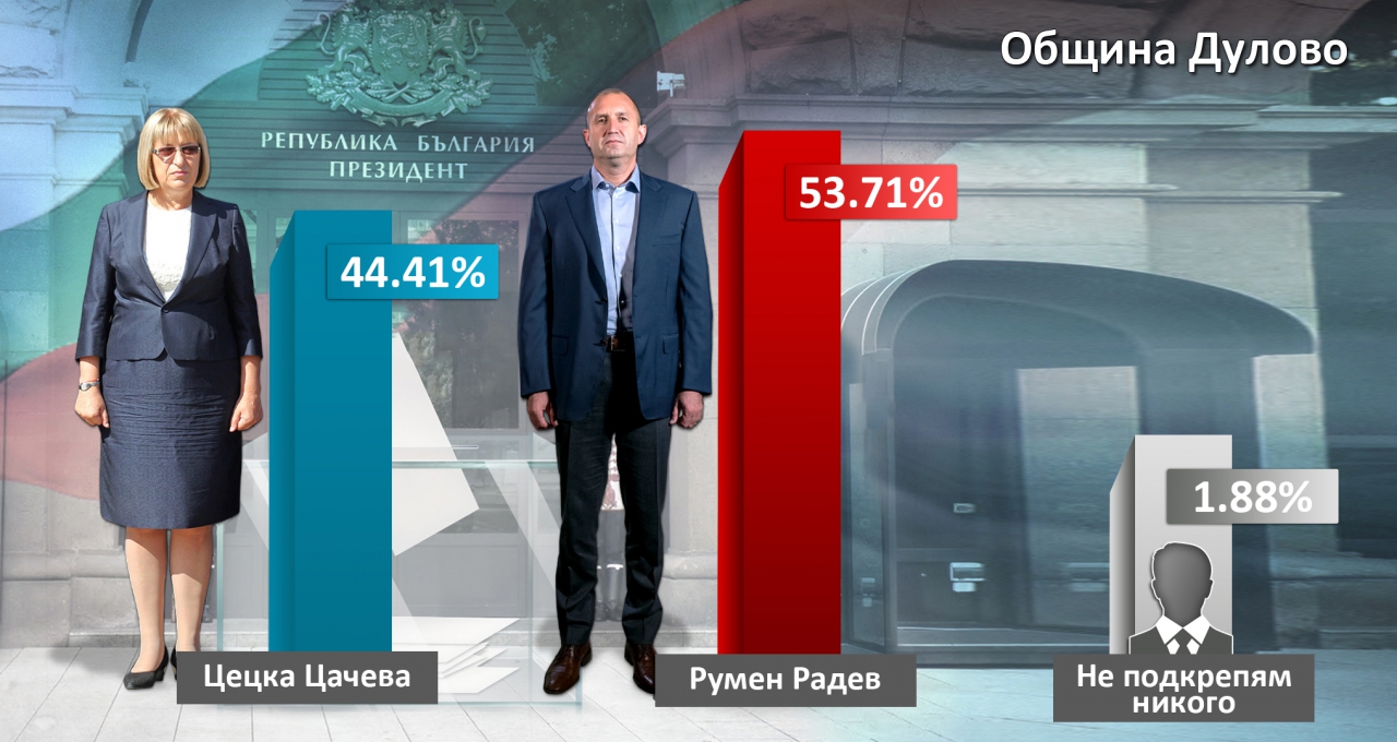 Кандидатпрезиденската двойка Румен Радев-Илияна Йотова спечели изборите в община Дулово на втория тур с 53,71 на сто.