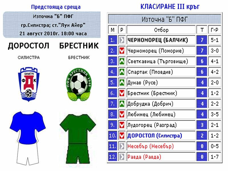 В събота 21 август от 18:00 часа на родния "Доростол" му предстои двубой от четвъртия кръг на Източна "Б" ПФГ. Опонент ще е състава на ФК "Брестник" Брестник. До момента актива на "Доростол" е с 2 точки и се намира на 10 място във временното класиране, на ръба за изпадане. След като отмъкнаха точка на фаворита от Поморие и изпуснахме да победим отбора на "Любимец" и загубихме в Търговище продължаваме да очакваме първа победа. Кратка справка за "Брестник ", който също е един от новаците в тазгодишния шампионат. Отбора е на 6 място, с 4 точки, като имат загуба в къщи от "Черноморец" (Бч) с 0:2, победи като гост "Равда 1954" (Равда) с 1:0, и завърши в последния кръг вкъщи с "Добруджа 1919" 0:0. Съдии на мача ще са Н. АТАНАСОВ от Велико Търново, с помощници Н.МАРИНОВ и А.АТАНАСОВ от Свищов, 4-ти съдия е ДР. ДРАГАНОВ от Варна.