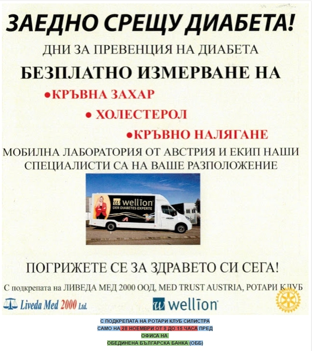 Софийското ООД "Ливеда Мед 2000", създадено през 1999 г. с предмет на дейност търговия на едро с медицински изделия и консумативи, провежда в страната, вкл. в Силистра (само на 28 ноември от 9 до 15 ч. на паркинга пред офиса на ОББ) безплатни изследвания за диабет, личи от рекламни дипляни, разпространявани с посредничеството на Ротари клуб Силистра, регионален партньор на инициативата.