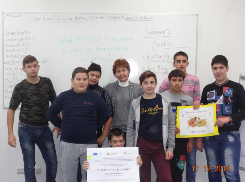 На следващия ден- 17.12.2016г., веднага след закуска учениците от двете групи организираха своите изнесени занятия по английски език в един от кабинетите на "Училище на бъдещето" в ДОЛ "Черноморски". Момчетата от група "Моята скорост" имаха възможност да представят темата на занятието "Robin Hood" по най различни начини - гледаха и коментираха предоставеното им по темата видео, рисуваха и писаха, създавайки собствени вариации по темата за легендарния герой. А учениците от група "Моята пластичност" имаха възможност не само да преведат двете басни на Соломон-"Пеперудата" и "Пръстенът", но и да драматизират двете притчи по много непосредствен начин чрез подръчни материали. Създадоха и златна книга с наименование "Solomon’s Parables", която ще продължат да обогатяват до края на учебната година.