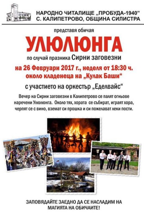 Народно читалище "Пробуда-1940" село Калиперово канят всички на 26.02.2017г. от 18.30 на празнуванео на Сирни заговезни в местността около кладенеца на "Кулак баши"