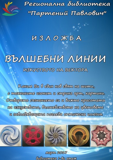 Днес на 7 март 2017 година от 17.00 часа, Регионална библиотека "Партений Павлович" открива авторската изложба на Христина Стойкова "Вълшебни линии, изкуството на вектора".